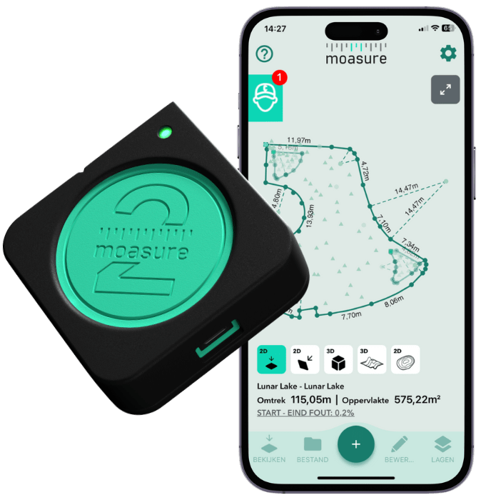 Het gebruik van traditionele meetinstrumenten leidt vaak tot fouten en giswerk bij het meten van complexe vormen. In plaats daarvan kunt u met de gepatenteerde technologie van Moasure, meten door middel van beweging om uw workflow te vereenvoudigen en te stroomlijnen – niet langer heeft u GPS of lasers nodig.
