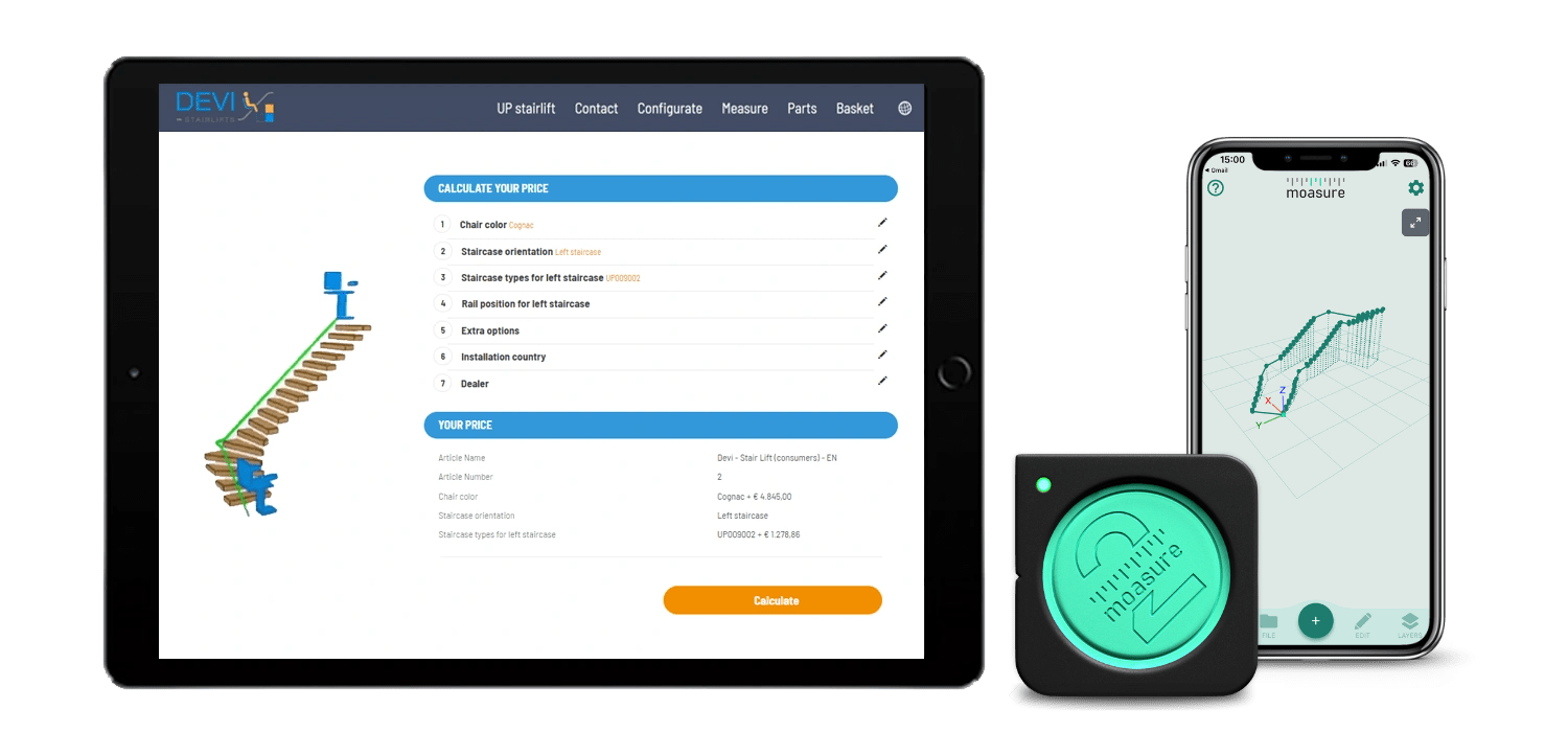 Zodra de meting is voltooid, kunnen de door Moasure® vastgelegde gegevens onmiddellijk worden overgedragen naar de webshopconfigurator van UP Stairlift, waar een gespecificeerde lijst met componenten wordt gegenereerd.*